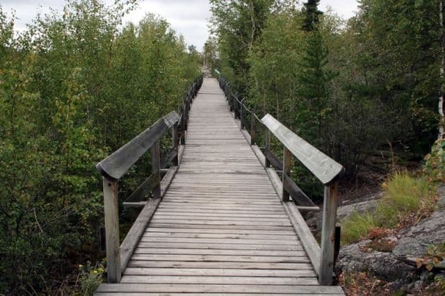 The Range Lake Trail follows a pebbled path most of the way. There are section of the trail which cross over raised wooden bridges and boardwalk designed to protect the sensitive shoreline of the lake. There are other sections of the trail walking over flat rock and boulders (Canadian Shield).
