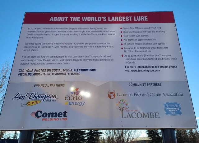 The giant lure was installed in 2019 and officially unveiled on June 1, 2019, during Lacombe’s annual Kids Can Catch Fishing Day.