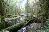 A wilderness trail following a creek through wet, moist forests, passing by thick clumps of ferns and piles of deadfall. The trail is a short, easy grade trail that leads to the coastline and Secret Cove.