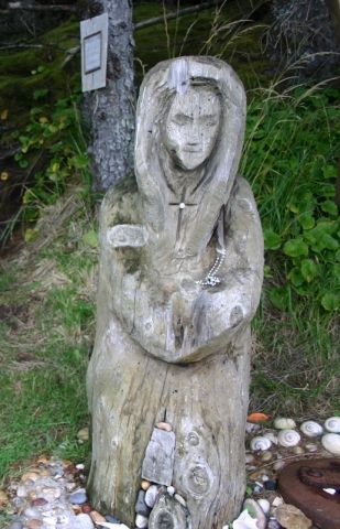 Praying from the side of the highway - complete with offerings at her feet of shells, rocks and sweet grass - stands St. Mary. She is one of the first wood carvings on the side of Hwy 16 driving north of Skidegate along with the Black Bear at Jungle Beach by Ted Bellis. A carver and a respected member of the Haida Gwaii people known for his caring soul and hospitality.
