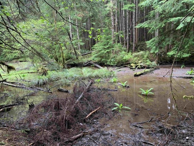 The trail is located directly across the road from Onward Point and the trailhead marker can be seen on Hydro pole 79. Unfortunately, the rainy weather has all but erased the marker indicating the name of this particular trail. Nevertheless, the trail represents a nice walk through the forest and around the pond (a nearby swamp). As you begin, the trail initially takes you through some moderately dense salal and shrubs before opening up into a forest dominated by spruce and some alders. I’m not sure how often the trail is maintained (there was some deadfall), but the route is very easy to navigate thanks to the white trail markers throughout. At the mid-way point, the trail splits and you have the option of doing the “quarry loop” or going around the pond. Regardless what route you take, you will still link back up with the main trail.