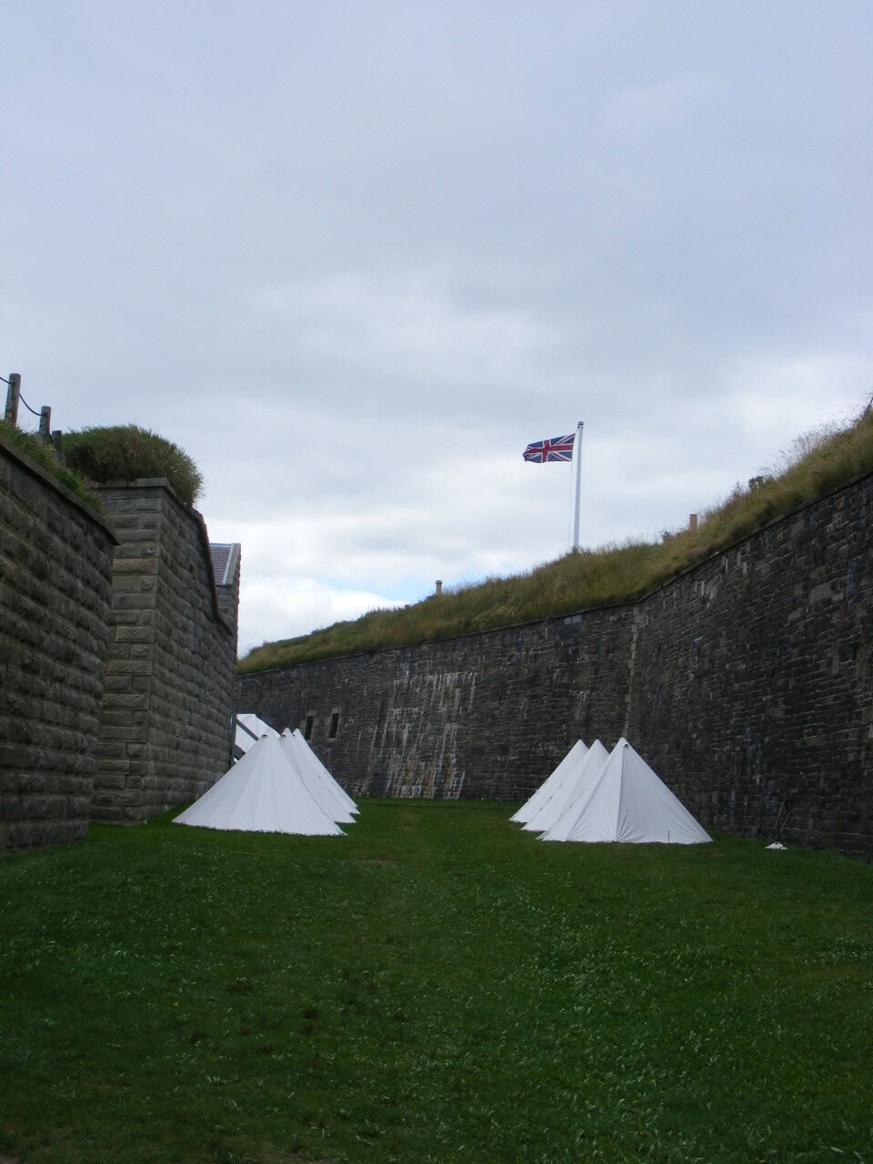 White tents stand in the trench beneath a British flag at the Halifax Citadel National Historic Site in Halifax, Nova Scotia, Canada, evoking Parks Canada history in Atlantic Canada.