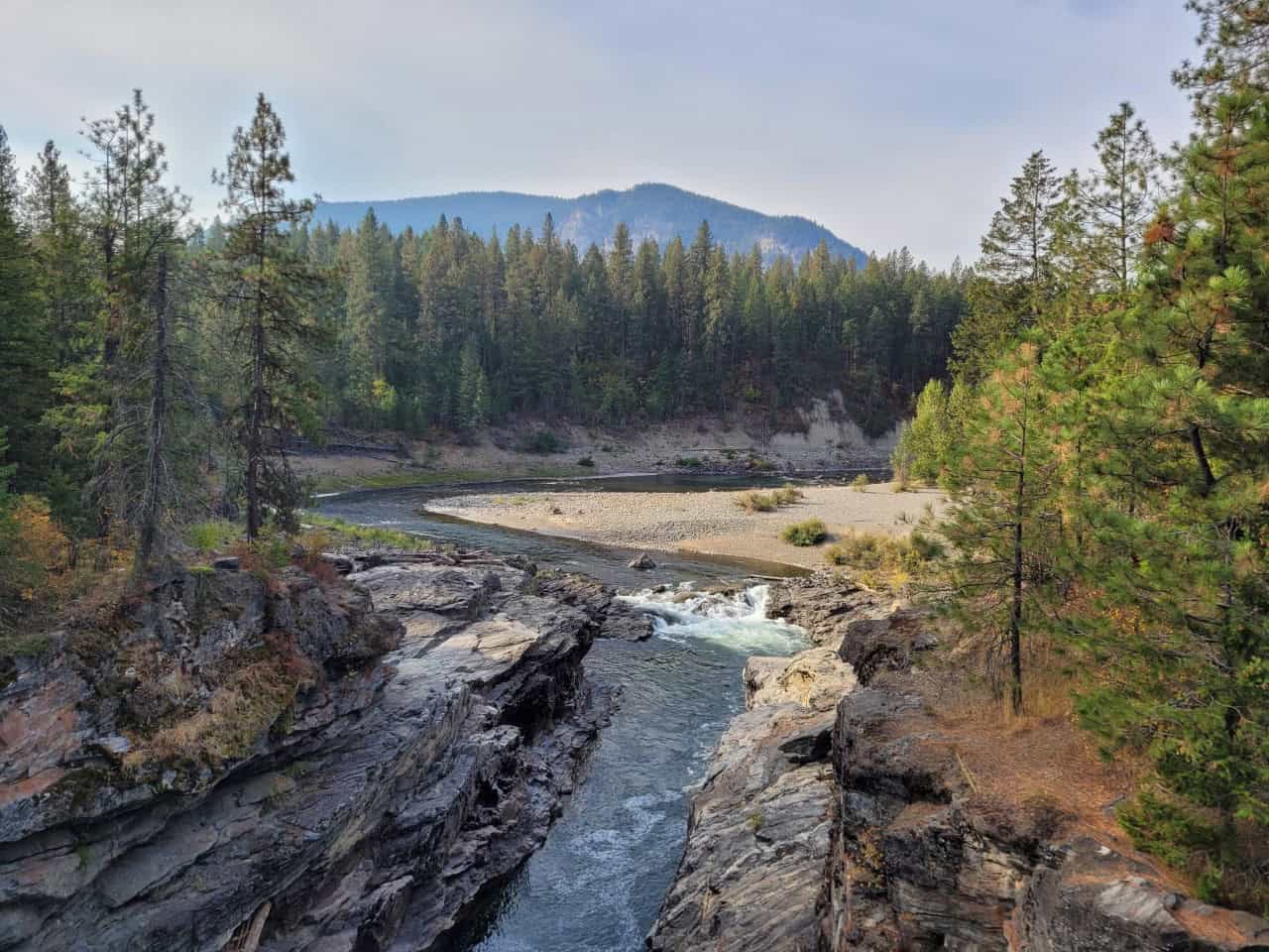 The Kettle River flows gently through a wide, shallow valley beyond Christina Lake. Its crystal clear waters flowed swiftly through its bed, inviting hikers and wildlife enthusiasts to pause and enjoy this tranquil riverside scene.