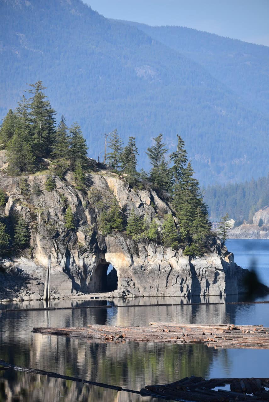 When Arrow Lake was created by the Keensley Dam the Columbia and Western Railway had to be moved to be moved to higher ground, but when water levels are low, the original tracks can be seen near the Labarthe Tunnel.