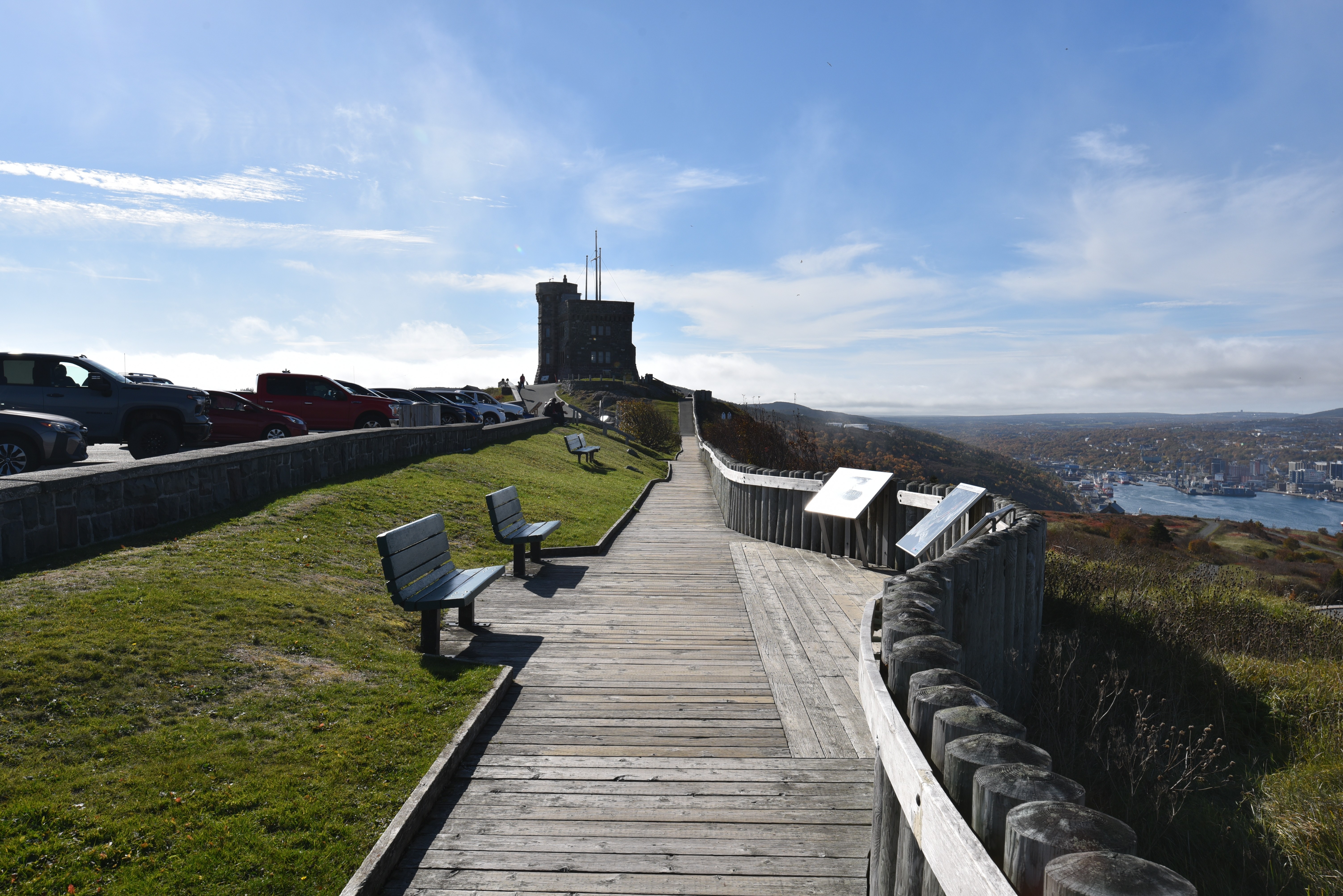 At the summit of the North Head Trail, the boardwalk leads to Signal Hill National Historic Site, offering sweeping views of St. John's. A moment to reflect on history, surrounded by rugged beauty and the endless Atlantic horizon.