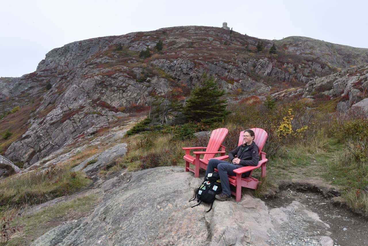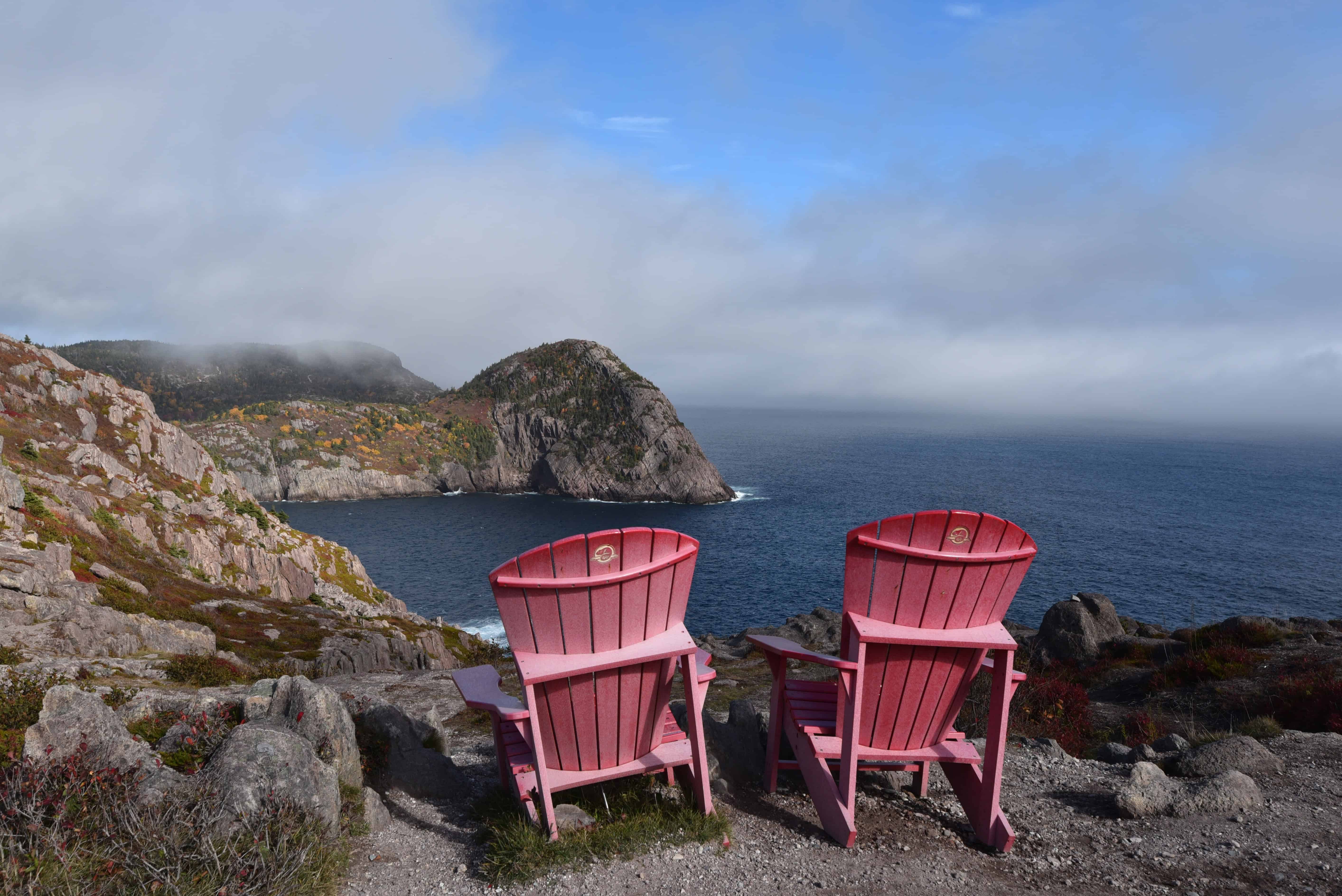 Relax in the iconic red Parks Canada chairs, perched with a perfect view of Cuckold's Cove along the North Head Trail. A serene moment amidst Newfoundland's rugged beauty, where the Atlantic’s whispers meet coastal charm.