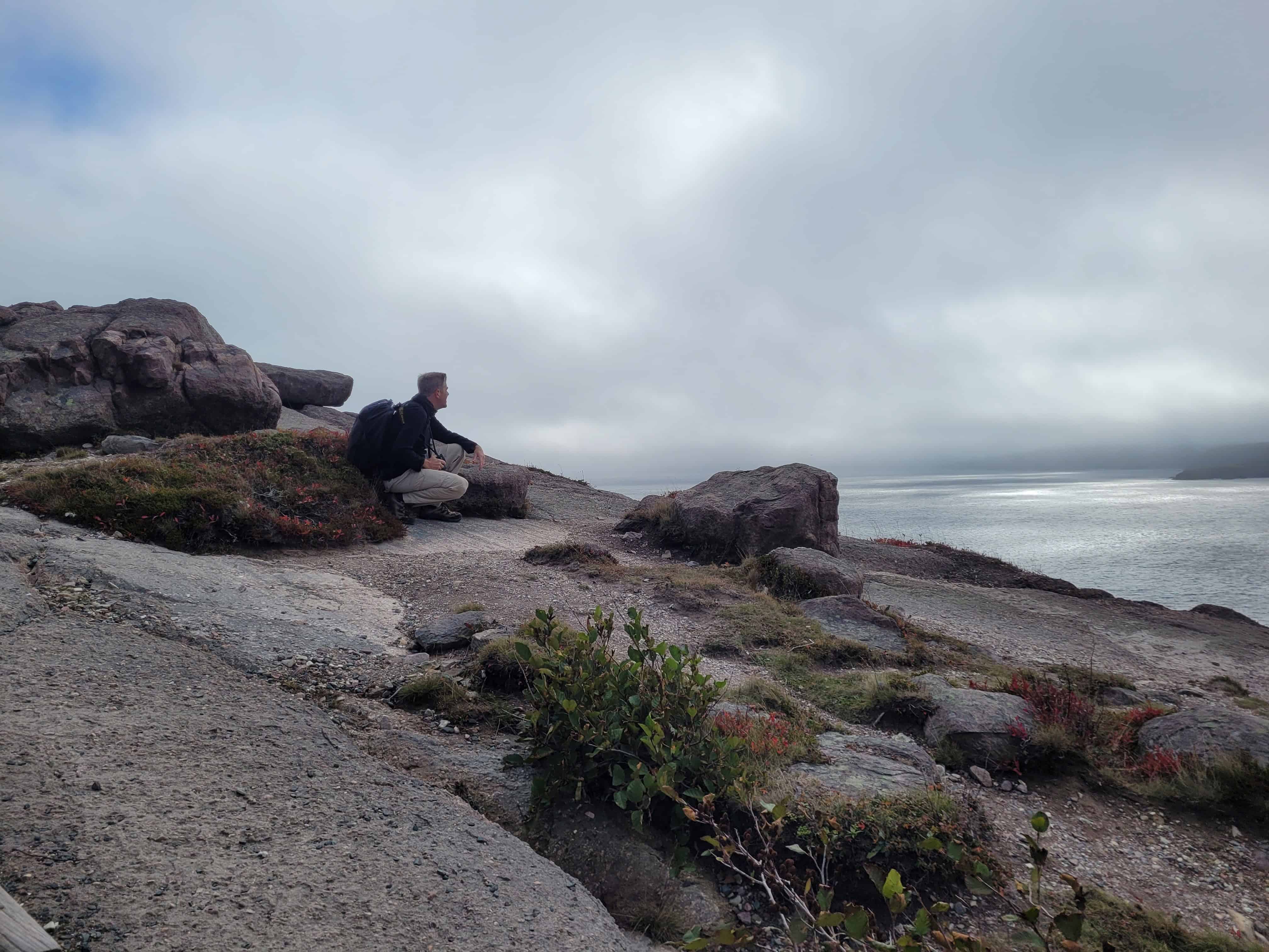 Pausing to take in the stunning coastal views along the North Head Trail, offering hikers a perfect moment to rest and admire St. John's rugged cliffs and the expansive Atlantic Ocean in Newfoundland.