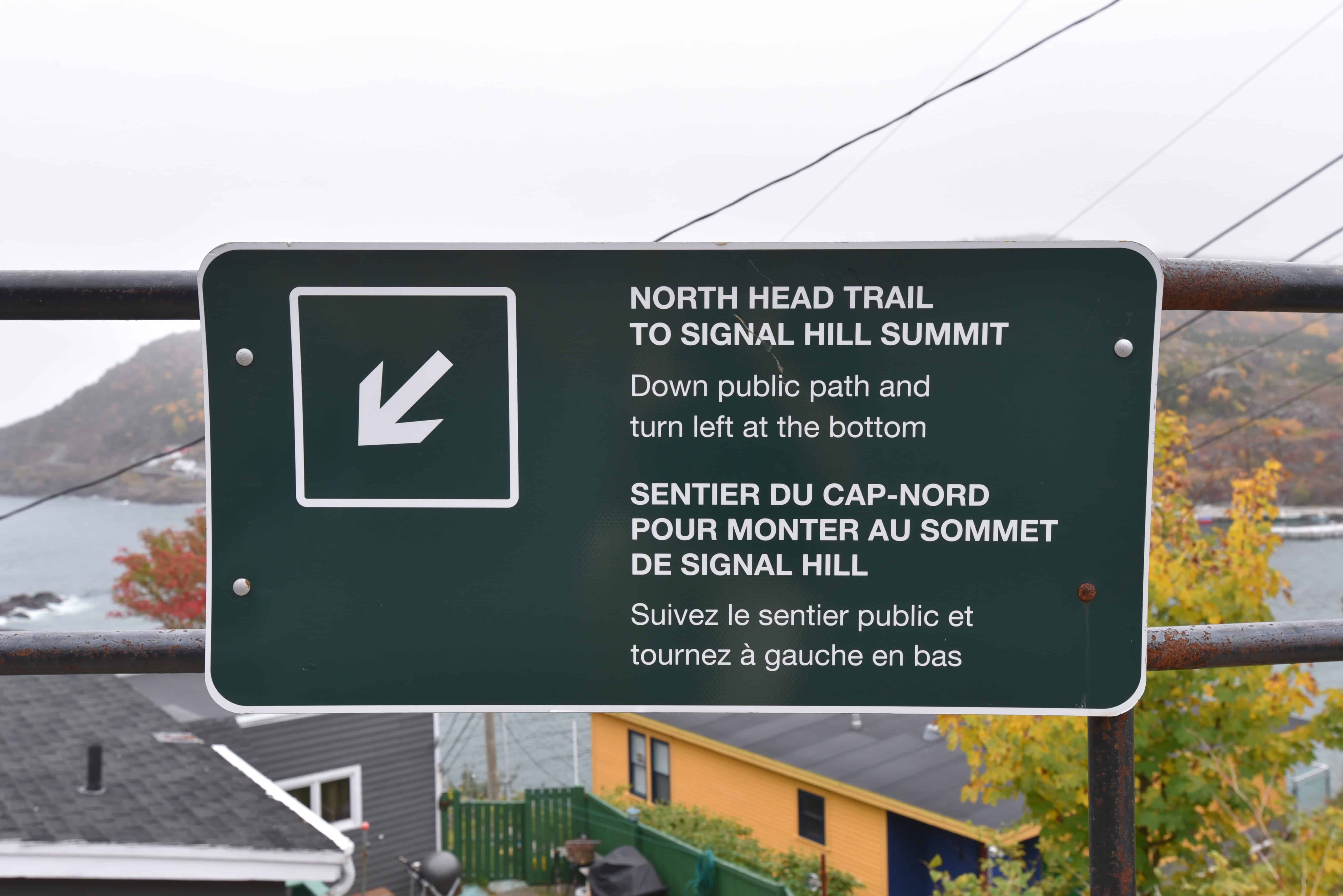 Clear signage marks the start of the North Head Trail at the end of Outer Battery Rd, St. John's, Newfoundland. This popular trail features history, natural beauty, and panoramic views.