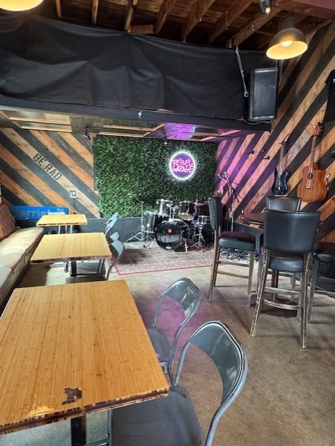One of the first things you notice on entering Rebel Garage is the graffiti and the brightest pink piano. This piano can be used in evening performances. No need for the band to bring one along.