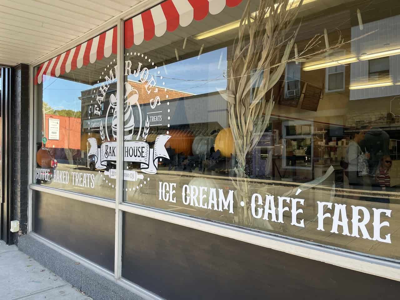This is the sidewalk view of Farmer Joe's Bakehouse in Waterford, Ontario. The signs and decor remind me of an old time ice cream parlour.