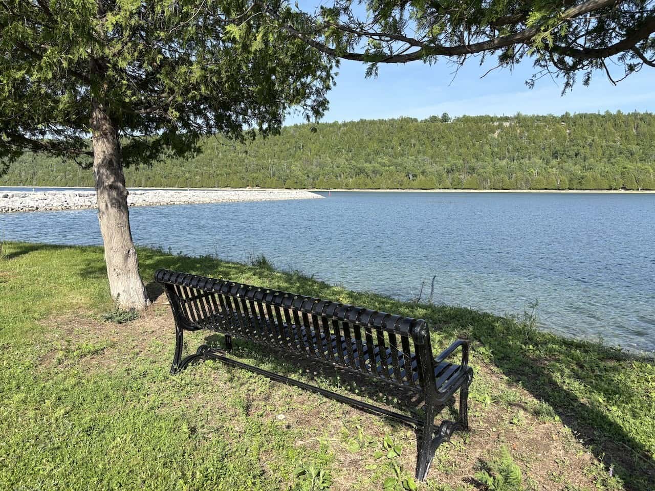 Benches overlooking the water have been thoughtfully placed so quiet breaks can be enjoyed at Fish Point Park in Gore Bay, Ontario, Canada.