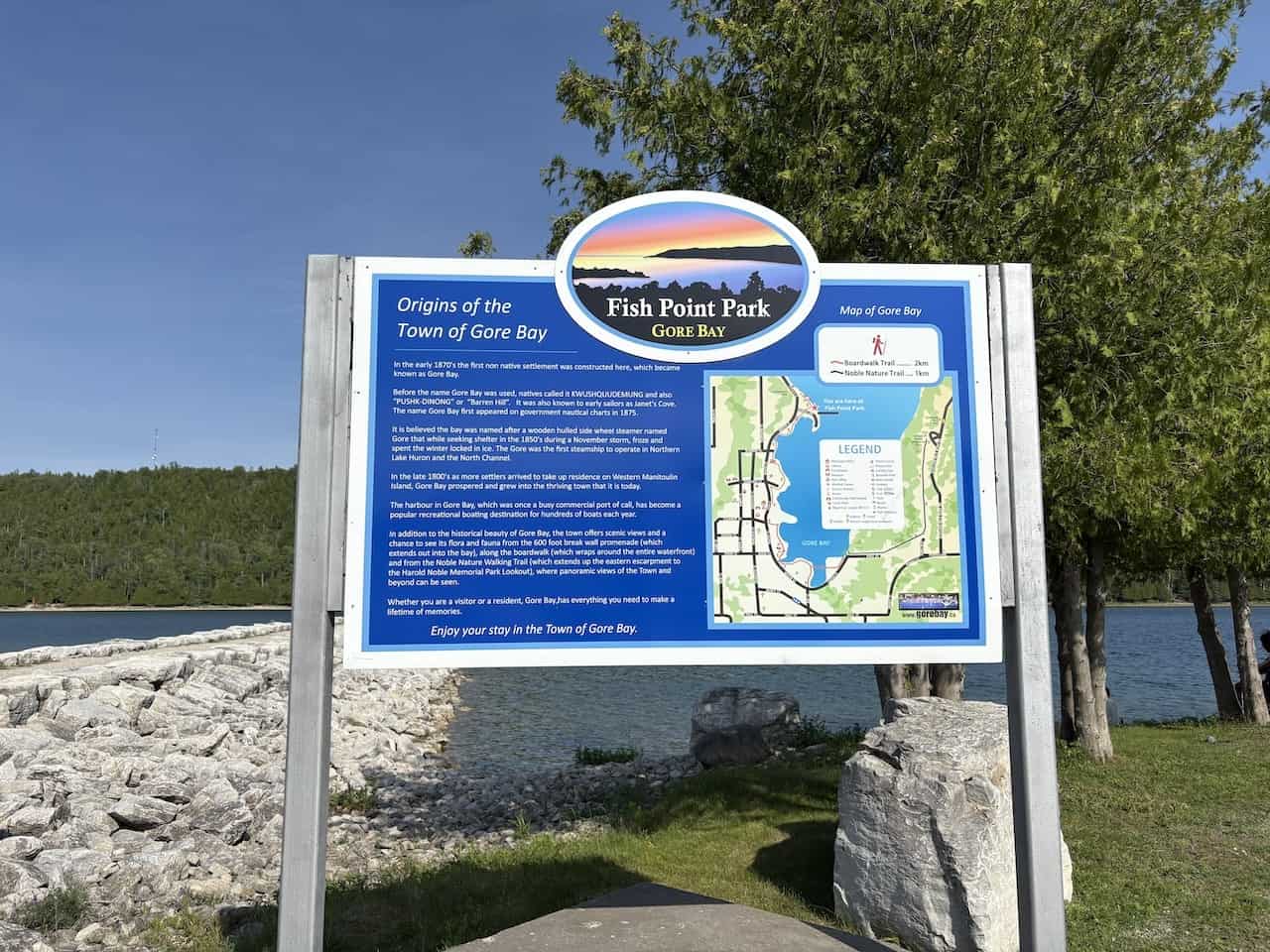 The history of Gore Bay and a map of the area is prominently displayed for visitors to Fish Point Park in Ontario, Canada.