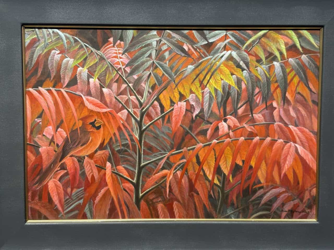 This picture, Study for Cardinal and Sumac, 1992, leaves us searching for a moment for the cardinal.