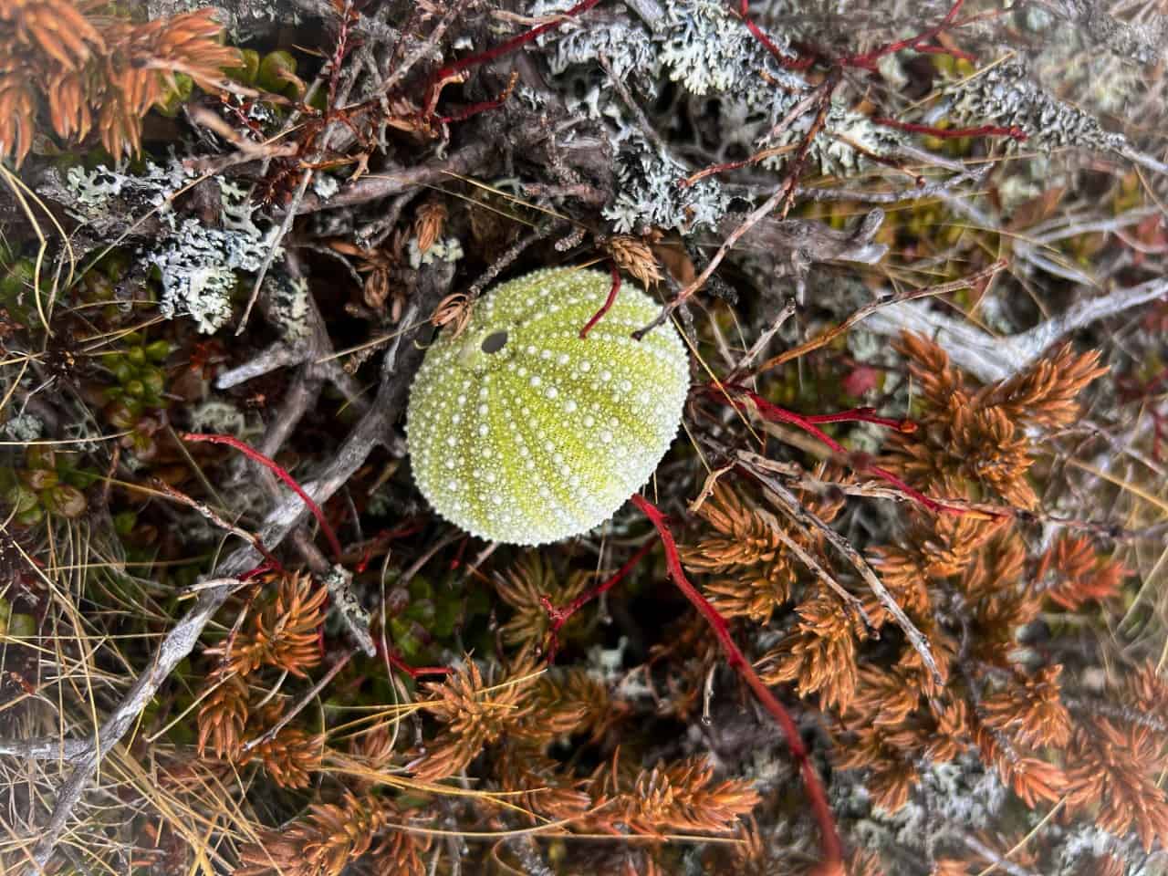 Empty sea urchin shells can not only be found on the beaches around Newfoundland , but also in the woods and on the trails. Sea birds like to feast on the tasty urchins and smash them on the rocks to get at the meat inside as they are quite prickly on the outside when alive.