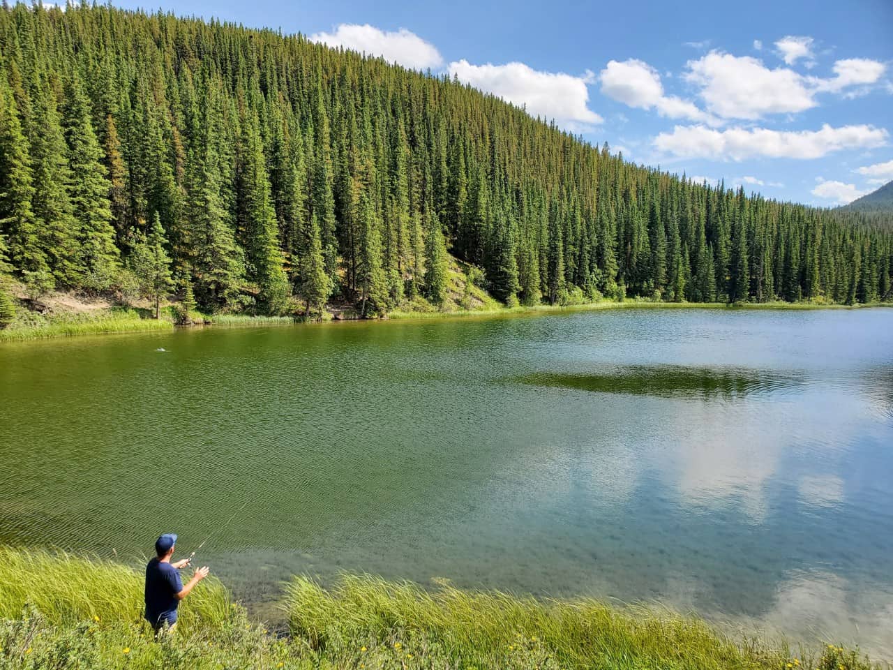 We saw many people fishing on Peppers Lake in Central Alberta. You'll find rainbow trout and brook trout swimming around in here. Most are just cute small ones, but there is the odd bigger one swimming around of course!