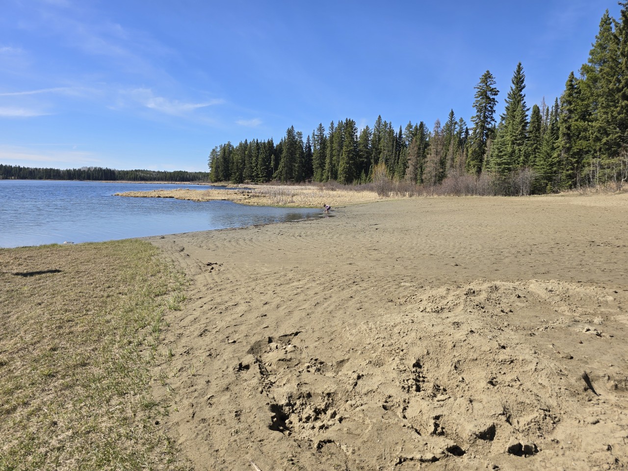 Sandy shoreline at Burnstick Lake in Clearwater County. As the weather warms, this peaceful lake becomes a favourite spot for relaxing spring days.