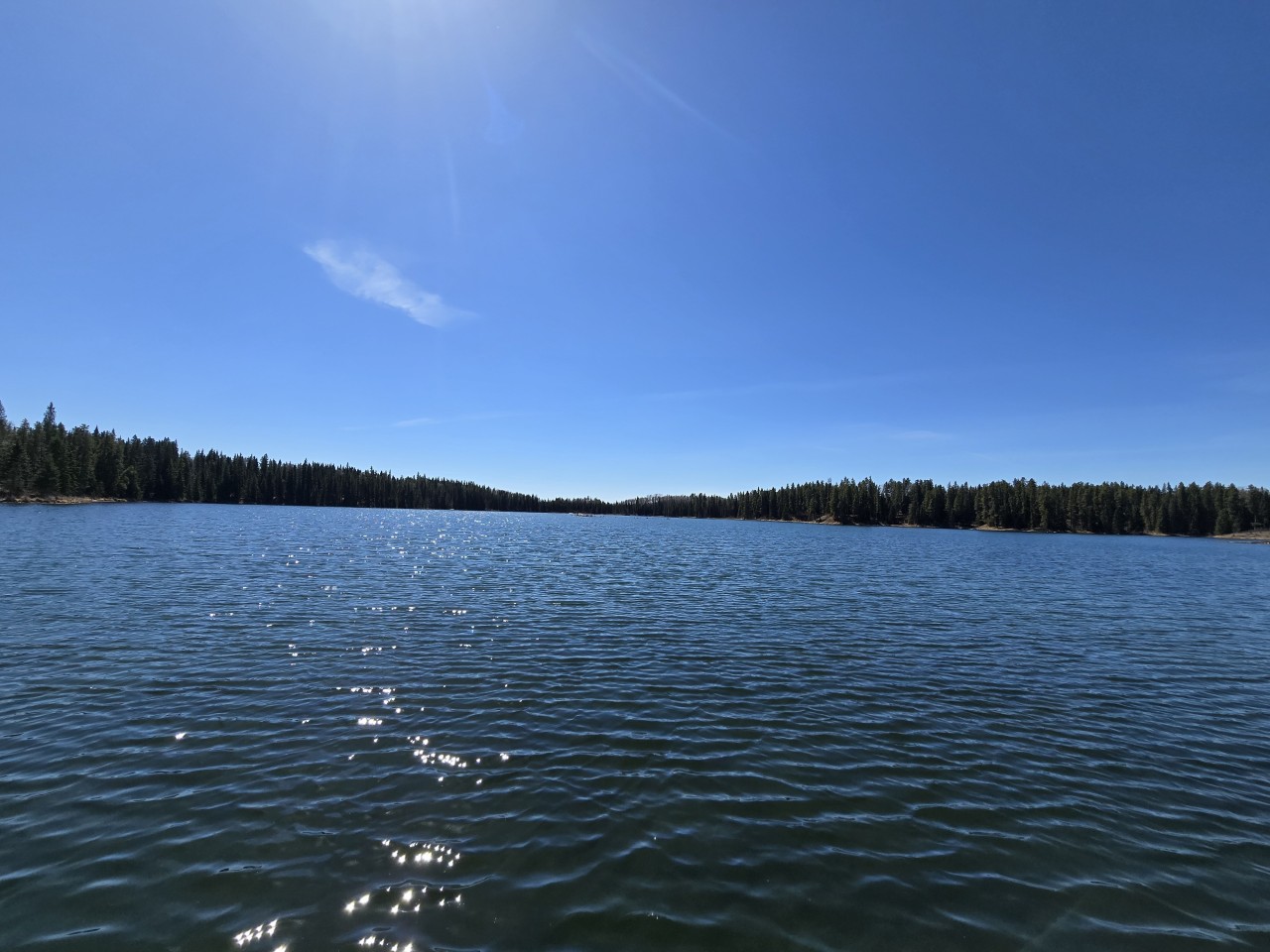 Birch Lake in central Alberta on a clear spring day, where forest-lined shores and calm waters create a perfect place to relax and explore.