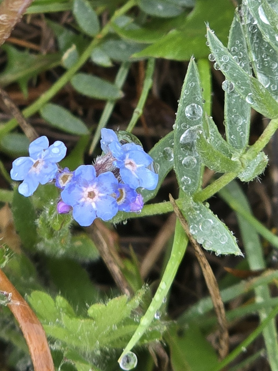 Tiny blue forget-me-not wildflowers covered in fresh morning dew are one of the first signs of spring returning to the forests and trails of Clearwater County, Alberta