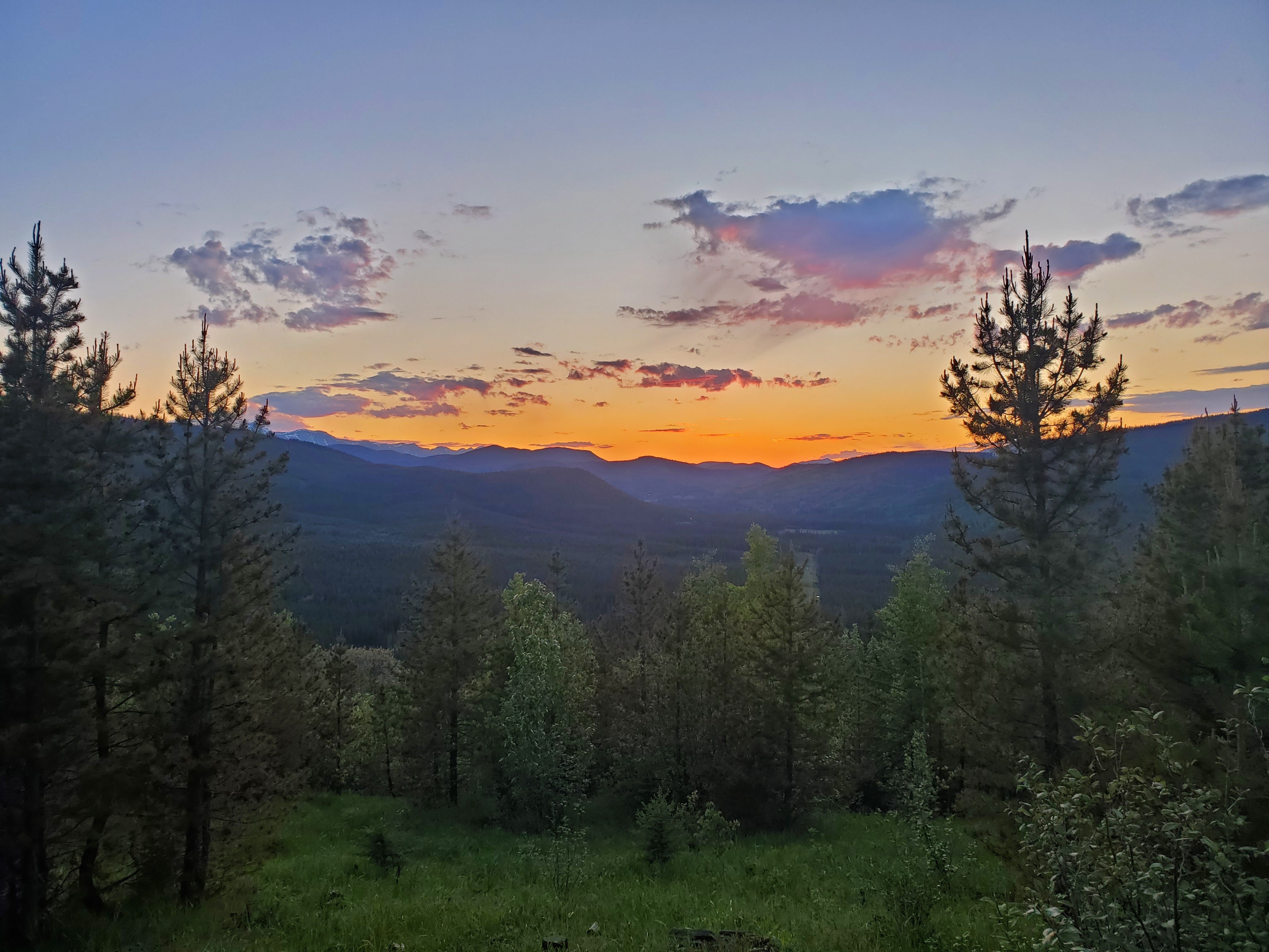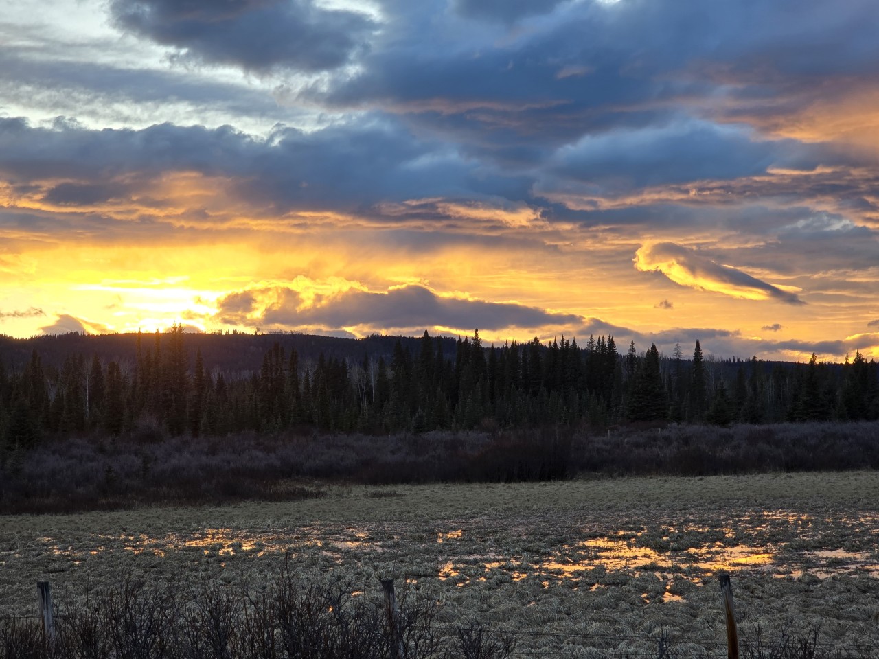 A glowing spring sunset over the forests and foothills of Clearwater County. Evenings here often end with spectacular skies