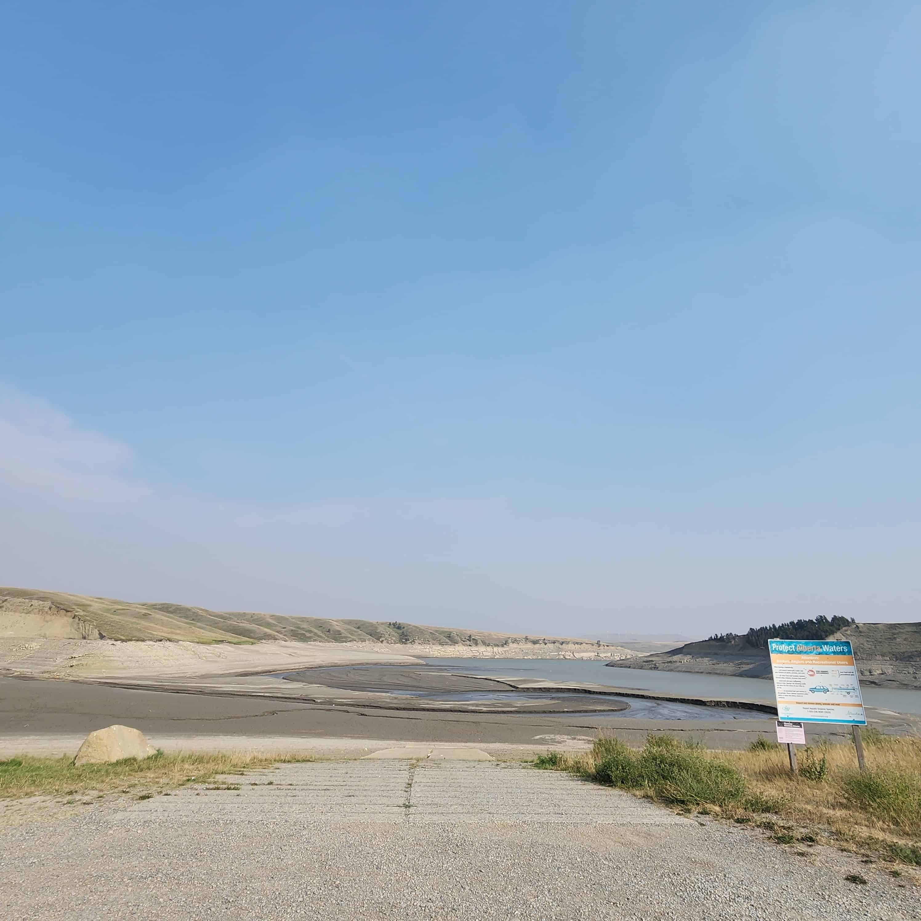 Summer drought in southern Alberta means no more water at the North Fork Campground on the Oldman River, rendering the boat launch here useless for now in August 2023