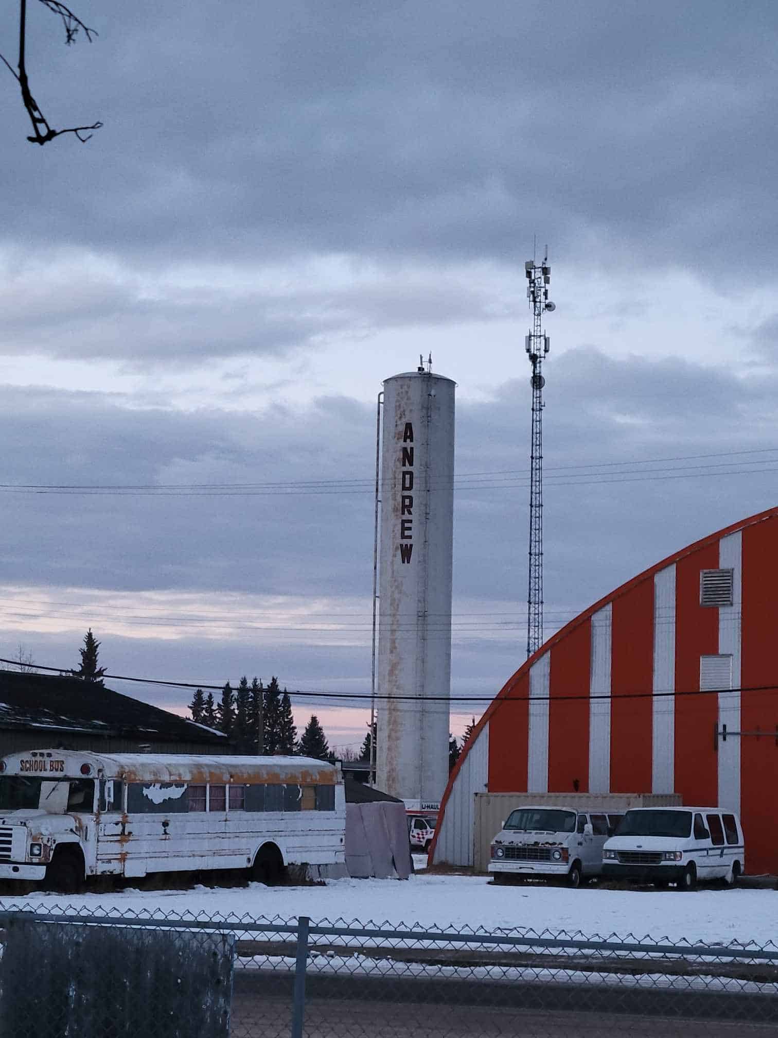The Andrew watertower can be seen while visiting the worlds largest duck at Lions Park