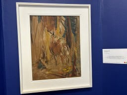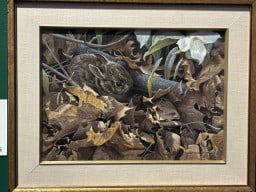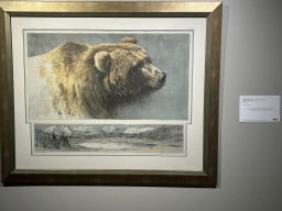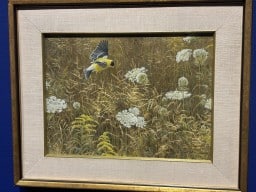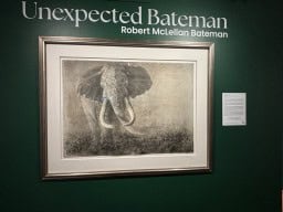 These birds can be moved about and changed from picture to picture. A cut-out image of Robert Bateman stands next to a board covered with birds.
