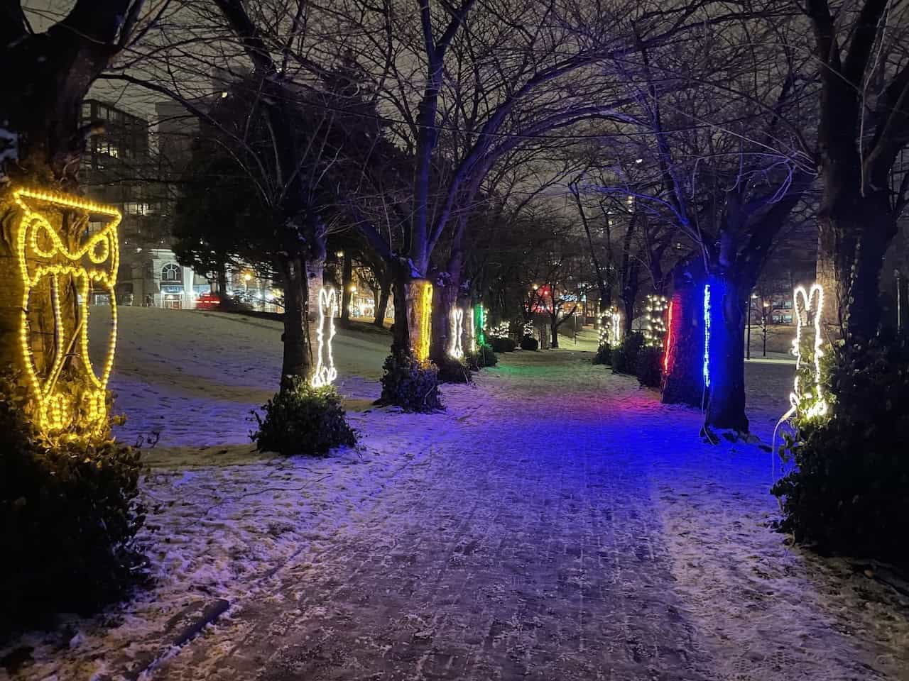 Each tree on this snowy walkway at Spencer Smith Park had a different type of bird or animal light on it.