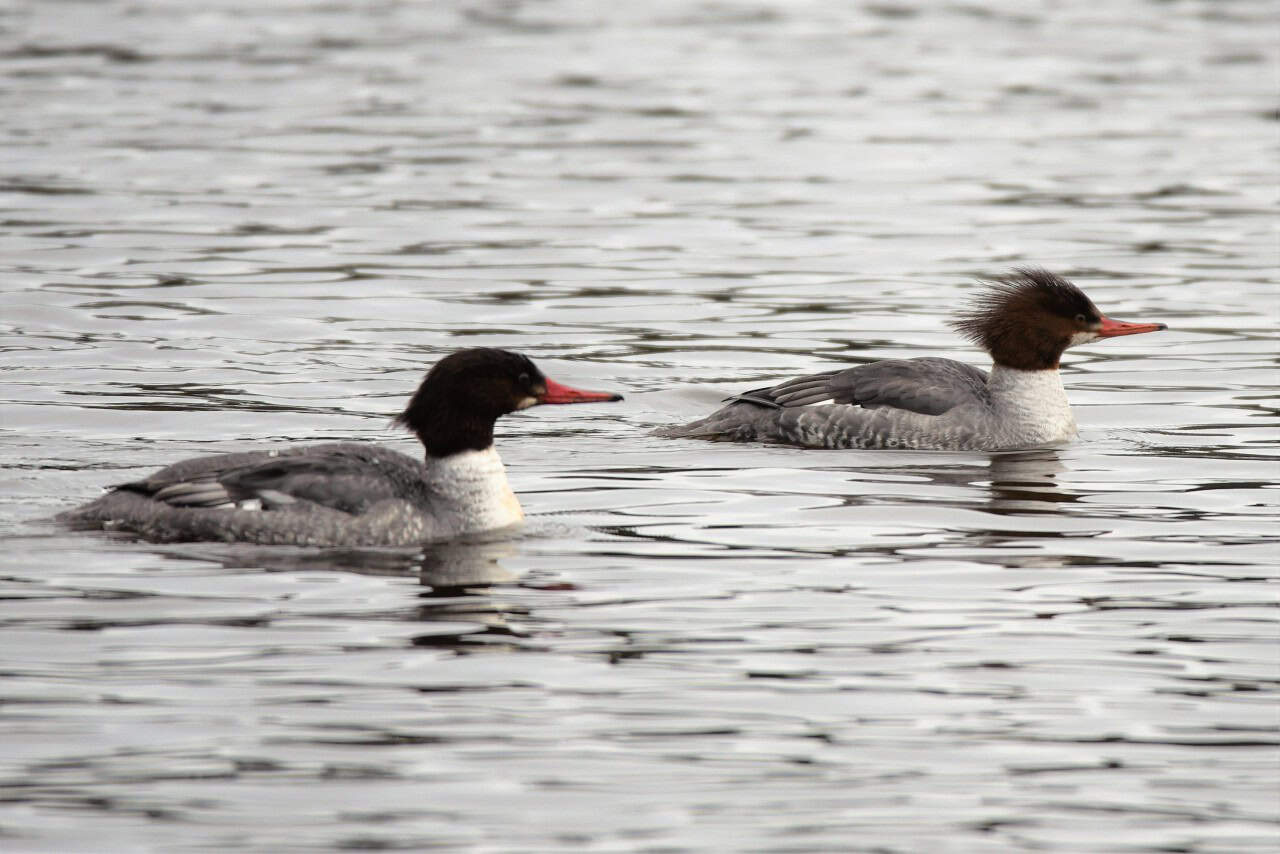 A pair of Common Mergansers swims together in Lost Lagoon, Stanley Park, offering a peaceful moment for bird watchers to connect with nature in the heart of Vancouver, BC.