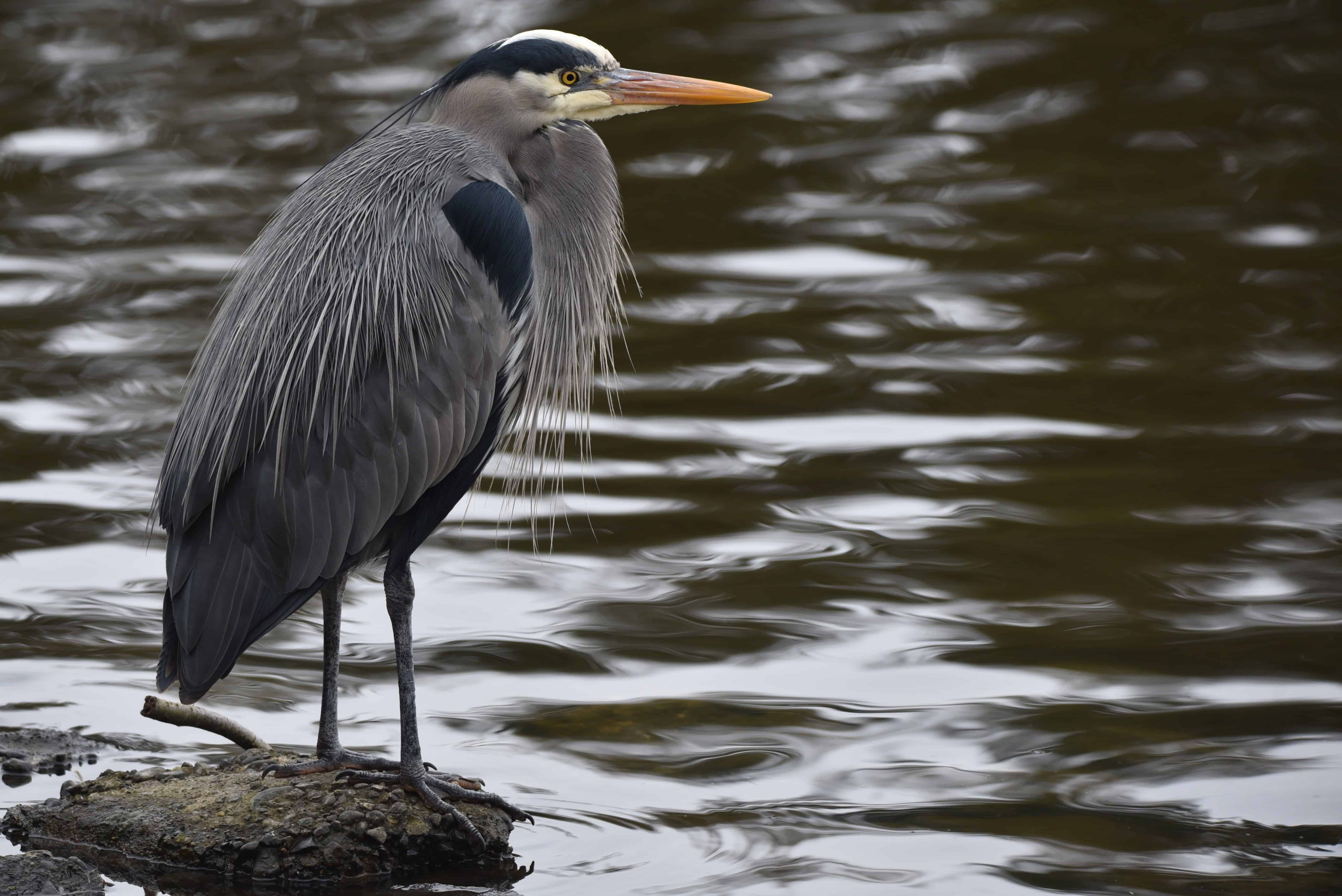 A graceful Great Blue Heron stands near the shores of Lost Lagoon, an iconic bird watching spot in Vancouver's Stanley Park.