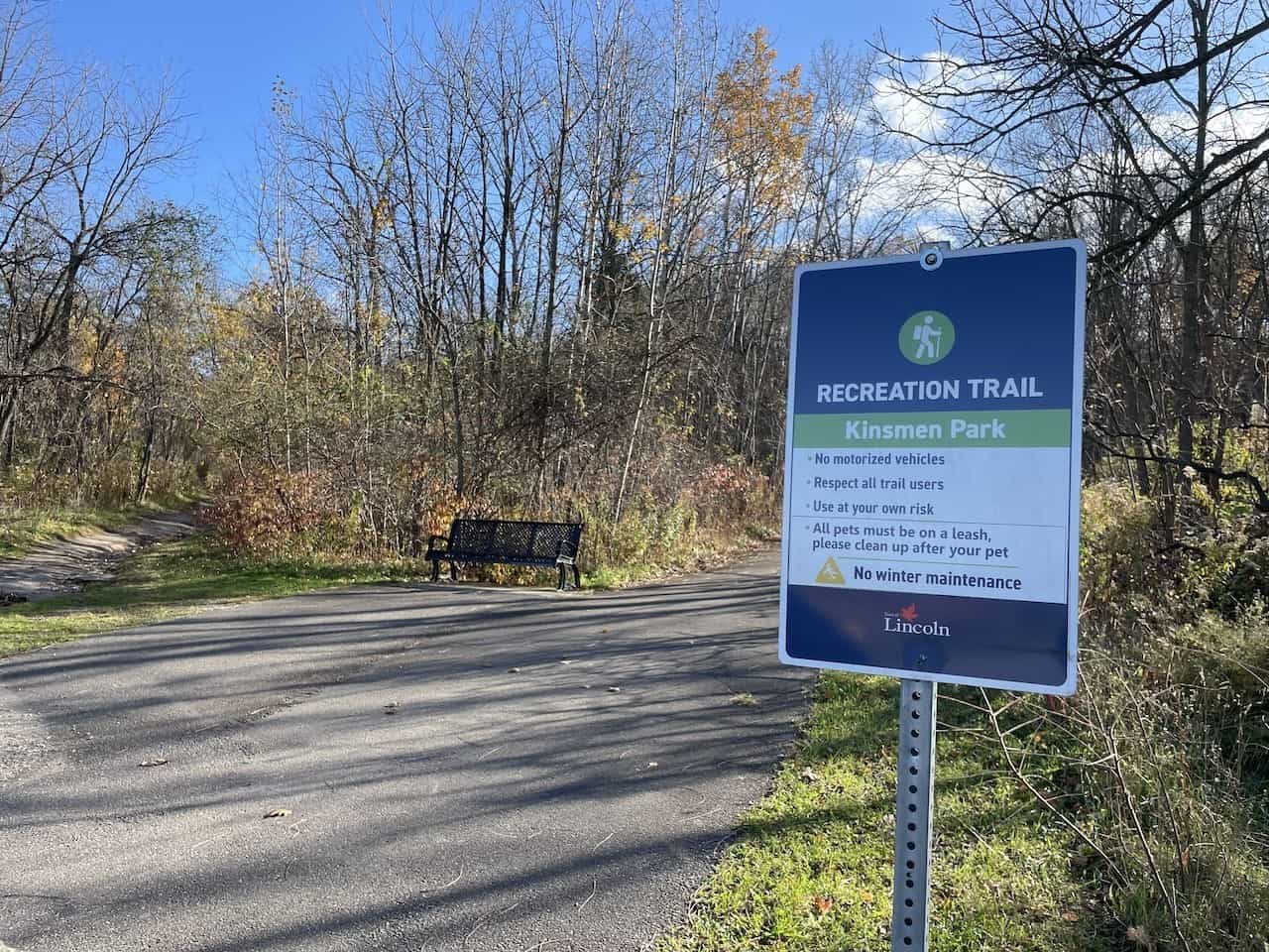 A sign with the recreation trail rules posted informs visitors of expectations on their visit to Kinsmen Park in Beamsville, Ontario, Canada.