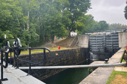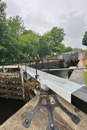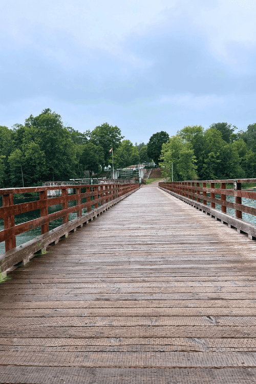 This historical, rustic, wooden plank walking bridge allows visitors to Hotel Kenney, to cross the Rideau Canal and explore Lock 42, the third and tallest lock at Jones Falls, Ontario.