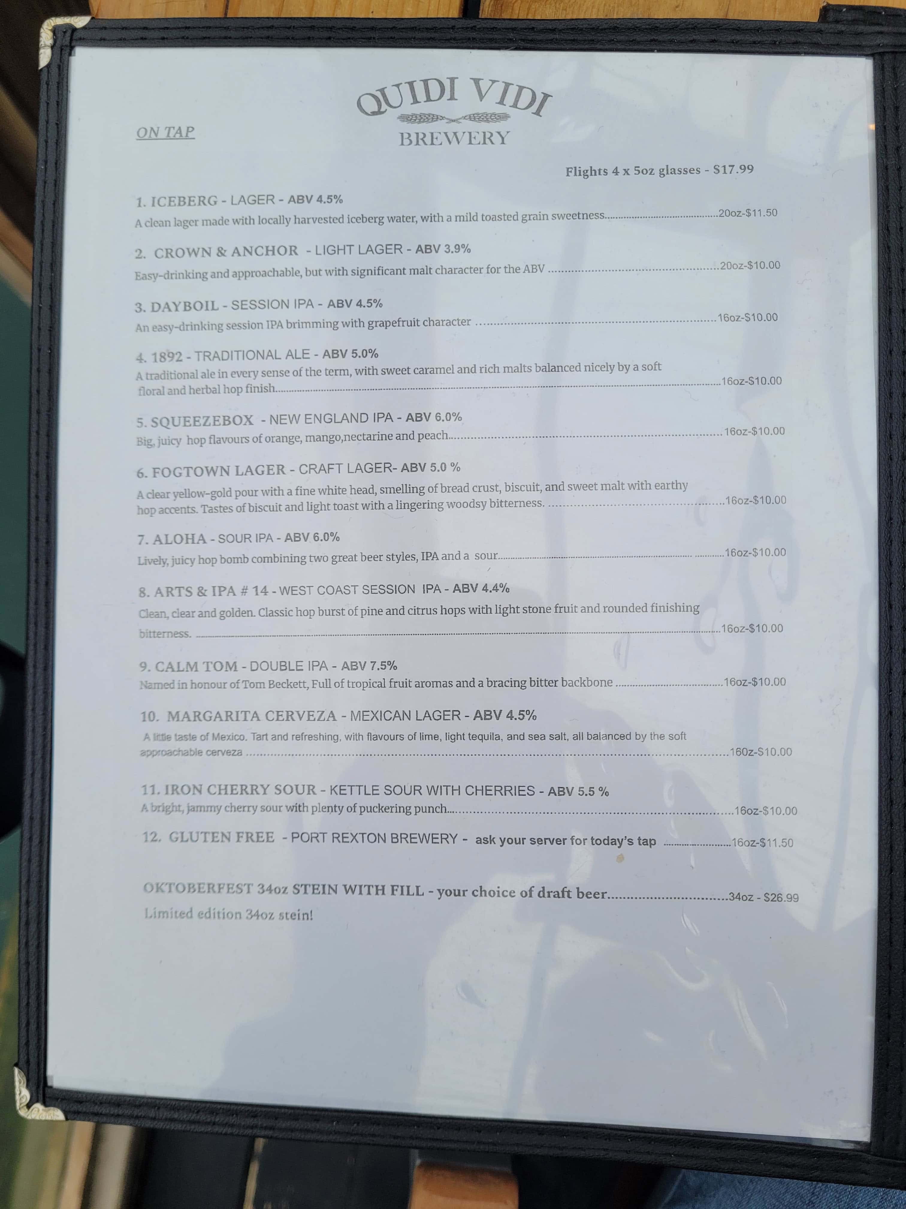 Discover the diverse flavors of Quidi Vidi Brewery with their extensive menu of locally crafted brews. From crisp lagers to bold ales, there's a perfect pour for every beer enthusiast.