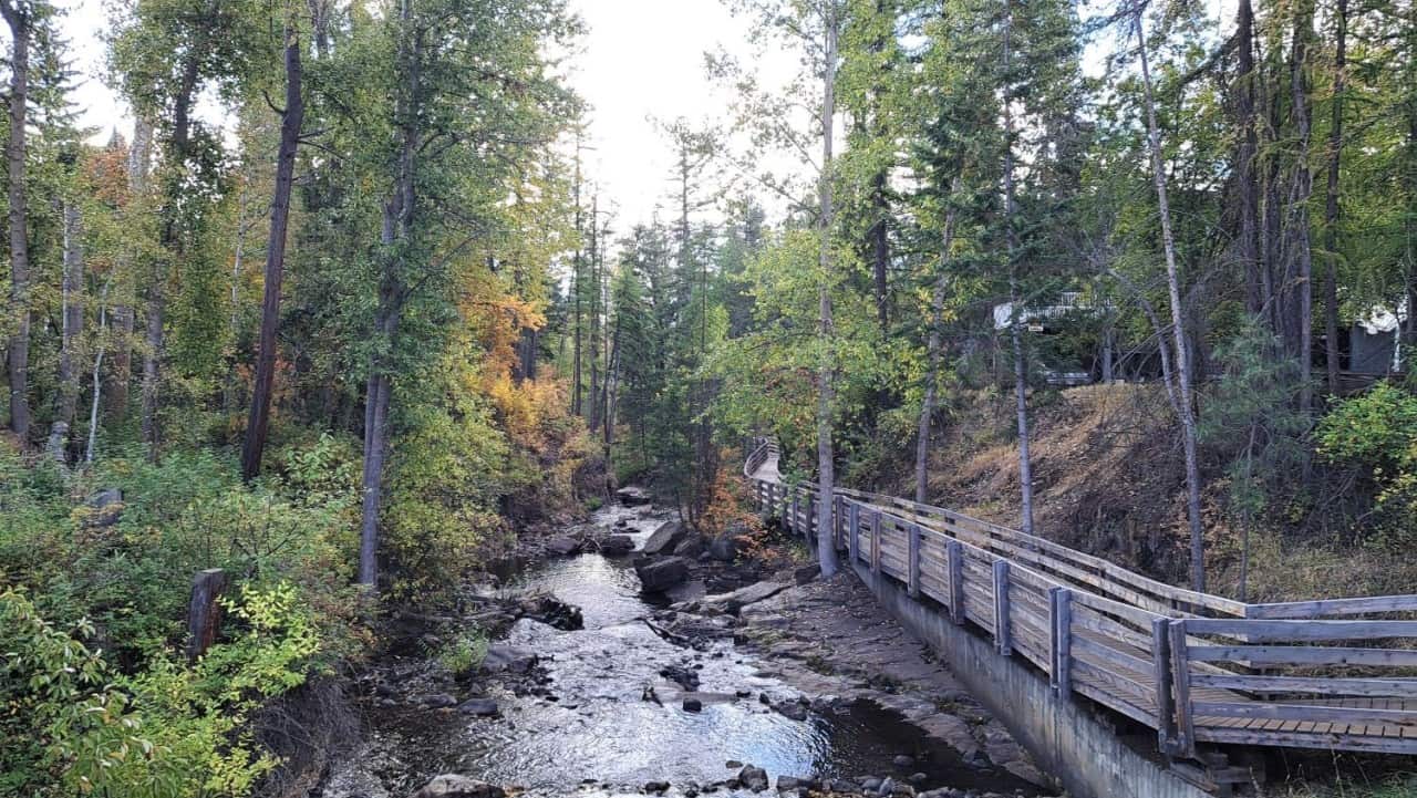 The boardwalk winds along Mark Creek under scattered cedar and fir trees. It’s a short, accessible section of trail perfect for families or anyone wanting an easy nature walk.