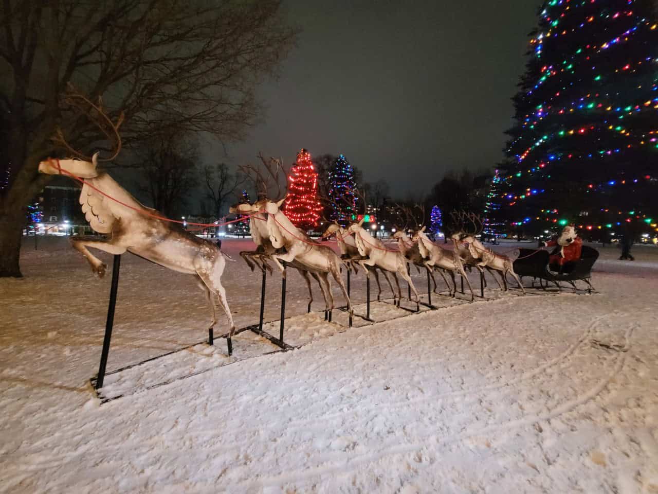 A glowing Santa and his reindeer display at Victoria Park's Lighting of the Lights in London, Ontario. This festive scene brings holiday magic to the park during the annual light display.