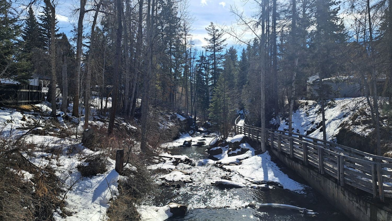 From the boardwalk, Marks Creek winds gently below. Winter light highlights the water and rocks, giving the creek a calm, reflective glow.