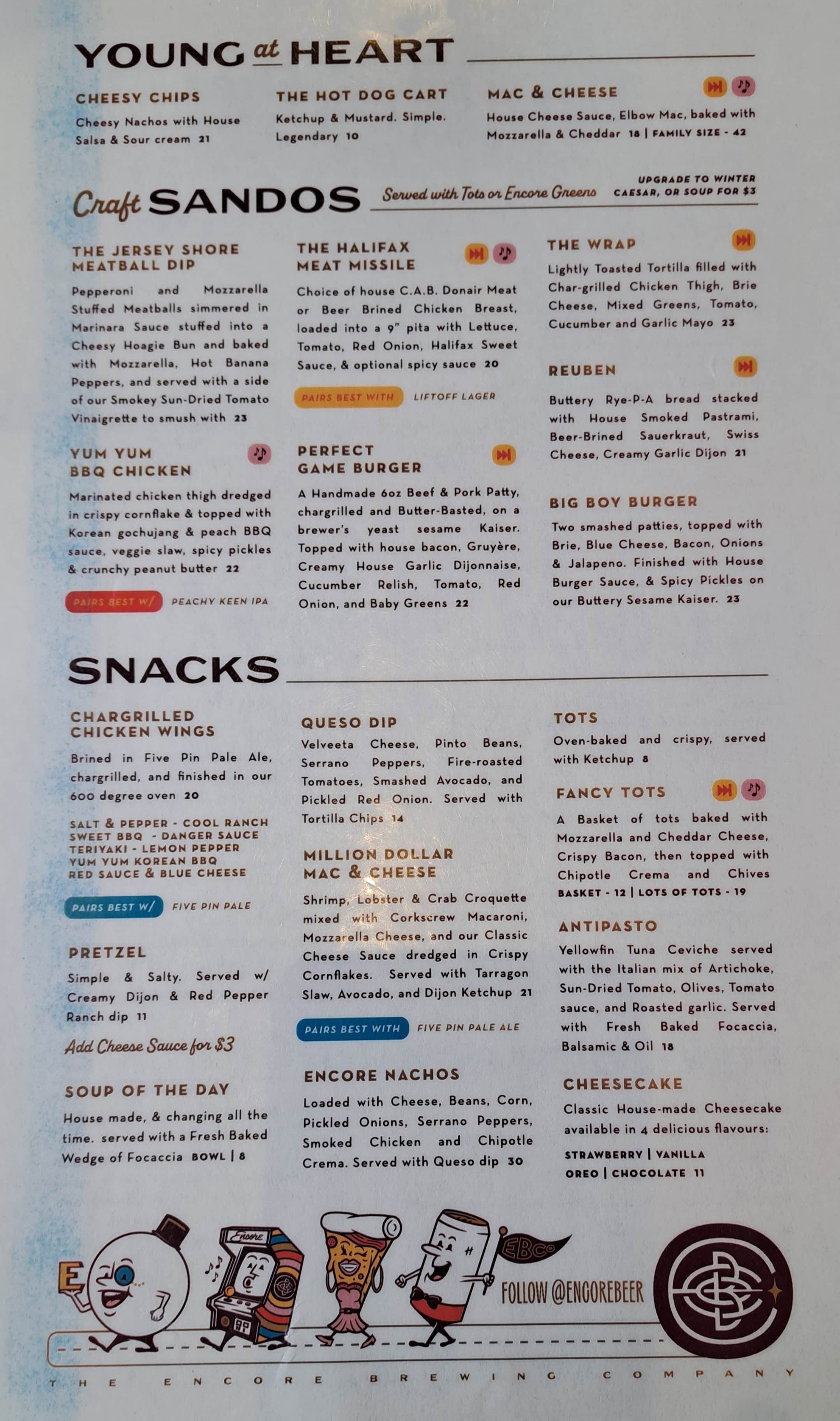 Encore Brewing Company menu board, showcasing craft beer, food, and casual dining options inside the Cranbrook BC bowling alley brewery.