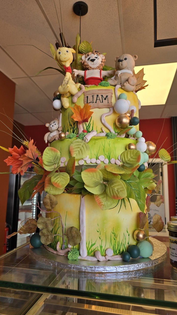 Detailed custom children’s birthday cake with animal theme at Mountain House Bakery in Red Deer