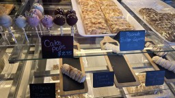 Fresh baked pies and dessert trays on display at Mountain House Bakery in Red Deer, Alberta, featuring classic flavours and ready to go treats.