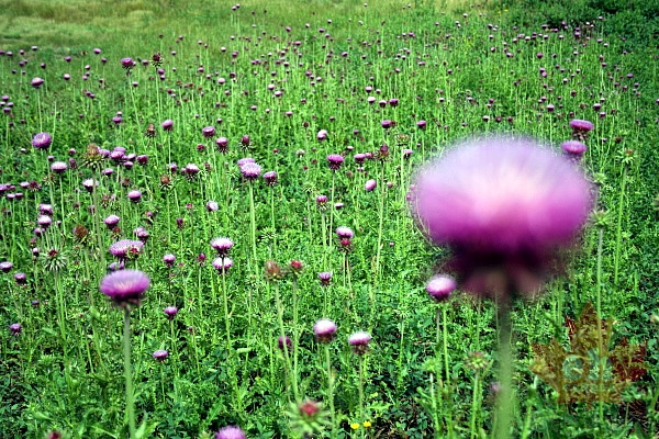 Nice photo effects of purple floral dots in a sea of green grasses and shrubs in the province of Saskatchewan. - Duck Island in Saskatchewan