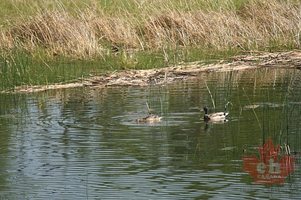 A couple of Canada Geese look like they may nesting in the tall grasses in the Elizabeth Hall Wetlands located in the City of Lethbridge in the southern region of Alberta, Canada.